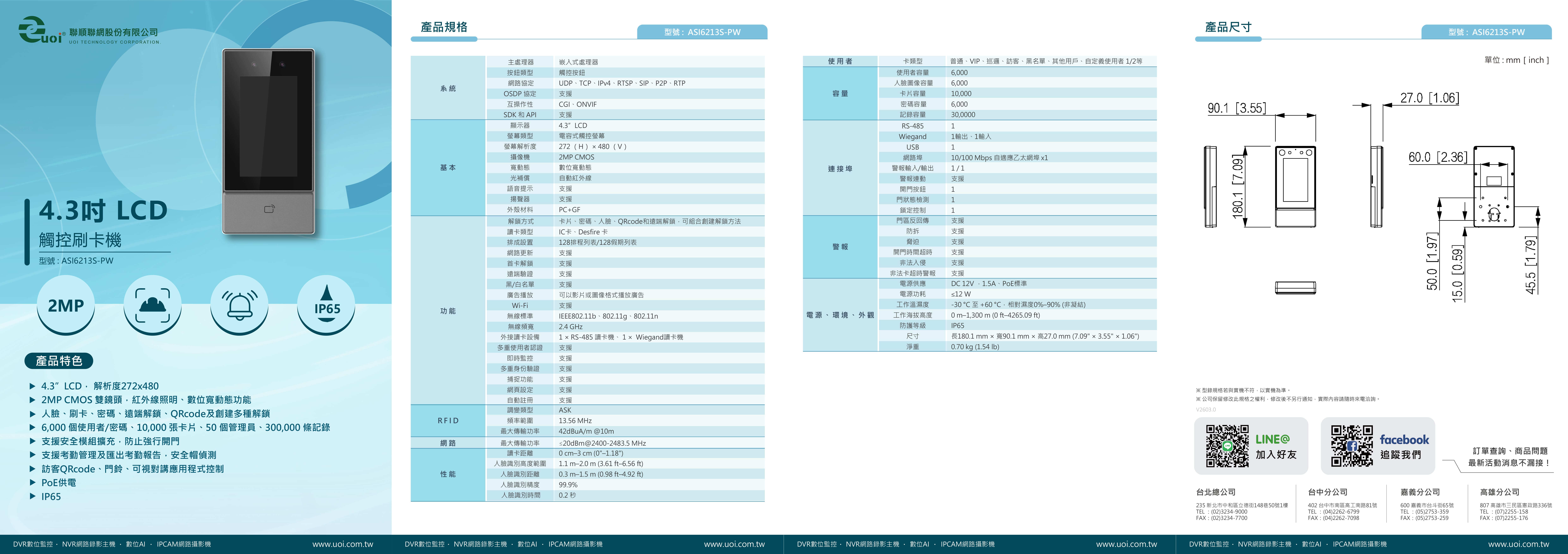 • 6,000 個使用者/密碼、10,000 張卡片、50 個管理員、300,000 條記錄